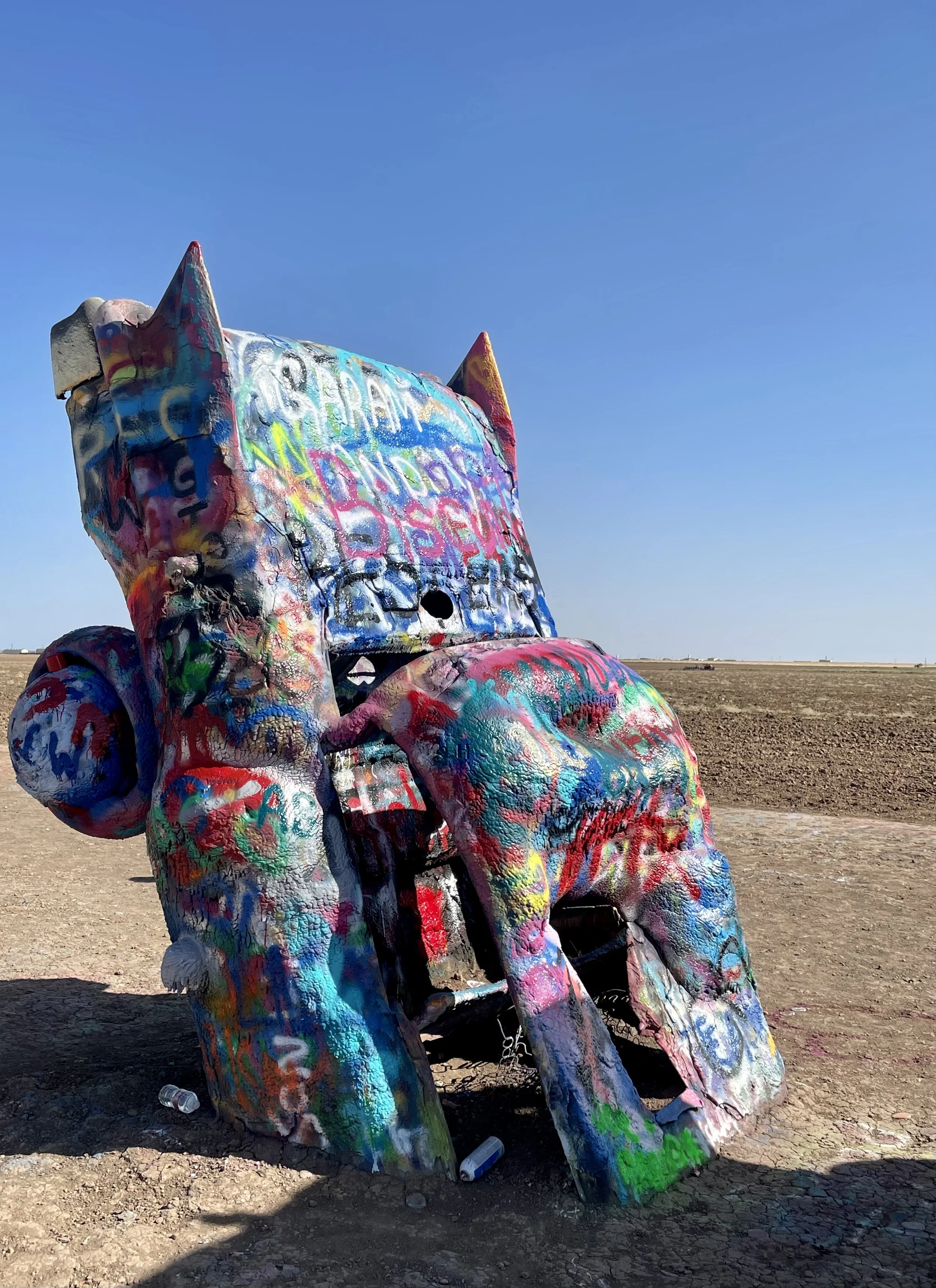 Just west of the Amarillo city line is one of our country’s the most noticeable art installations. Created in 1974, artists buried 7 Cadillacs nose first into the ground. Visitors can now come to spray paint the cars, making each visit unique. For Jack, I brought some kid friendly sidewalk chalk for him to make his mark. However, a fellow visitor offered him an almost empty bottle of spray paint. Probably against our better judgement, we showed him how to use it, prayed several prayers for him not to spray the paint in his eyes and let him have a good time. All went pretty well although we did discover that spray paint does not come off of skin with soap and water. It just takes a few days to eventually rub off!