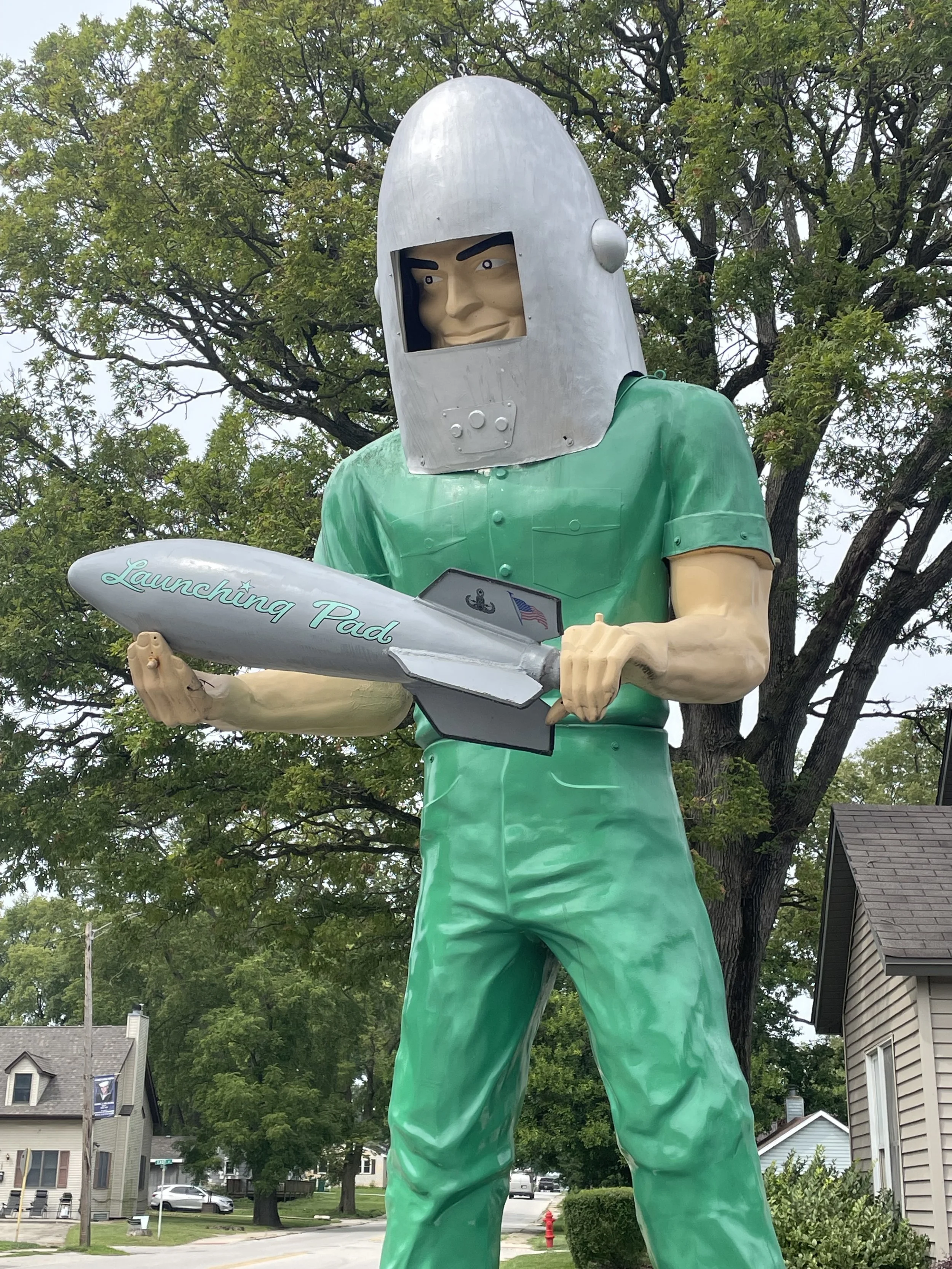 This iconic statue of Route 66 is located in the parking lot of the now closed Launching Pad diner and was created in the 1960s as part of a Muffler Man advertising campaigns There have been several efforts to open the diner back up, but to date those have not seemed to be successful. While we were visiting, two other vehicles of road trippers stoped by to take pictures of this statue so it was nice to know we were not alone in our admiration for this somewhat lonely space man.